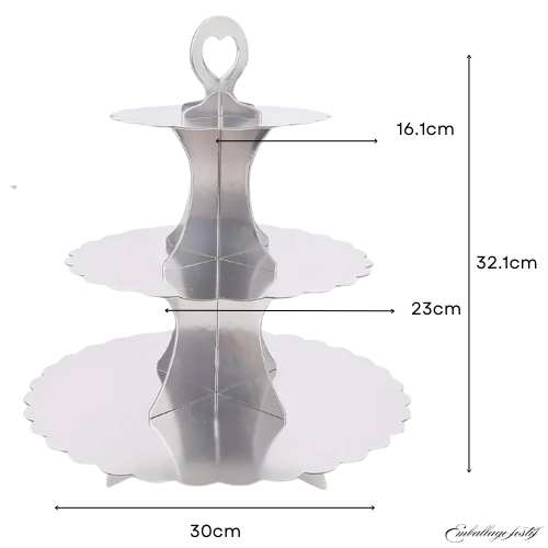 Sublimez vos événements festifs avec ce support à gâteau 3 étages en carton argenté, conçu spécialement pour offrir à vos desserts un écrin de choix. Avec sa finition argentée brillante et son design élégant, ce présentoir est l’accessoire idéal pour rehausser la présentation de vos gâteaux, cupcakes, macarons, ou autres douceurs, que ce soit pour un mariage, un diner entre famille ou amis, ou toute autre fête.